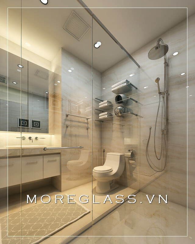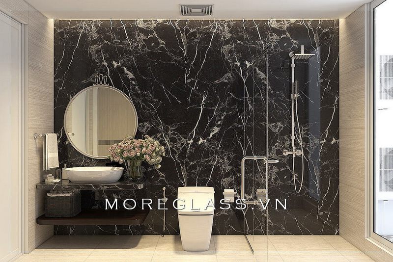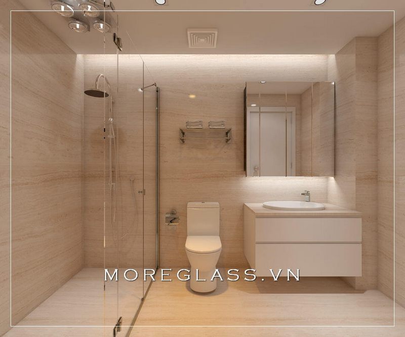 Phòng tắm chung cư được trang trí bằng các thiết bị vệ sinh hiện đại, được bổ sung thêm gương trang trí, đá ốp tường và vách tắm kính.