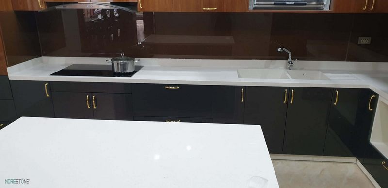 Đá ốp bếp màu trắng là một yếu tố đặc biệt góp phần tạo nên sự ấn tượng cho không gian phòng bếp.