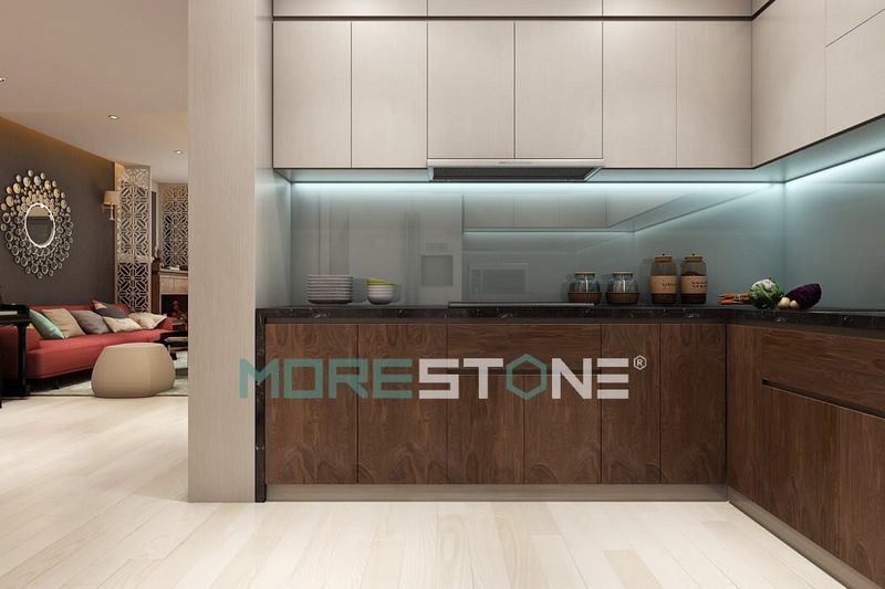 Ngoài ra, việc kết hợp hai hoặc nhiều màu sắc cũng đang trở thành xu hướng thú vị. Ví dụ, việc phối hợp giữa đá ốp bếp ghi xám và tủ bếp màu gỗ có thể tạo ra một cái nhìn đầy sức sống mà vẫn lịch thiệp. Bên cạnh đó, các họa tiết nổi bật trên nền đá cũng góp phần gia tăng chiều sâu cho không gian bếp khi kết hợp với các phụ kiện trang trí cùng tông màu chủ đạo. Điều này giúp căn bếp không chỉ phục vụ chức năng nấu ăn mà còn trở thành nơi trải nghiệm nghệ thuật sống động trong từng góc nhỏ.