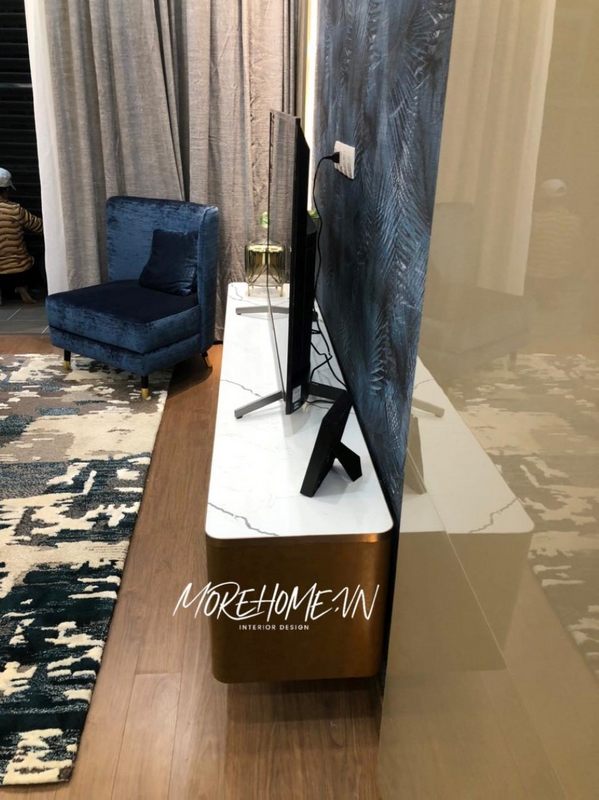 Hình ảnh thi công thực tế mẫu kệ tivi phòng khách bằng gỗ công nghiệp kết hợp mặt đá nhân tạo vân mây cao cấp của Morehome